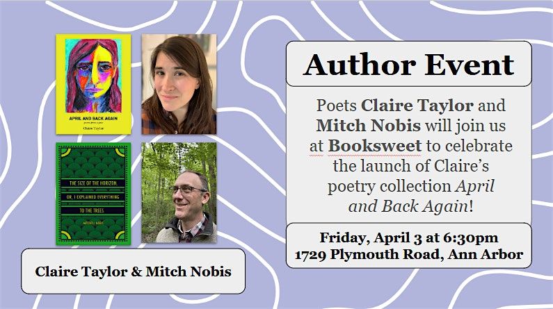Booksweet is thrilled to welcome poets Claire Taylor and Mitch Nobis for an evening of poetry to celebrate the release of Claire's debut poetry collection, April and Back Again! Join us for readings from Claire and Mitch, author Q&A, book signings, and light refreshments!