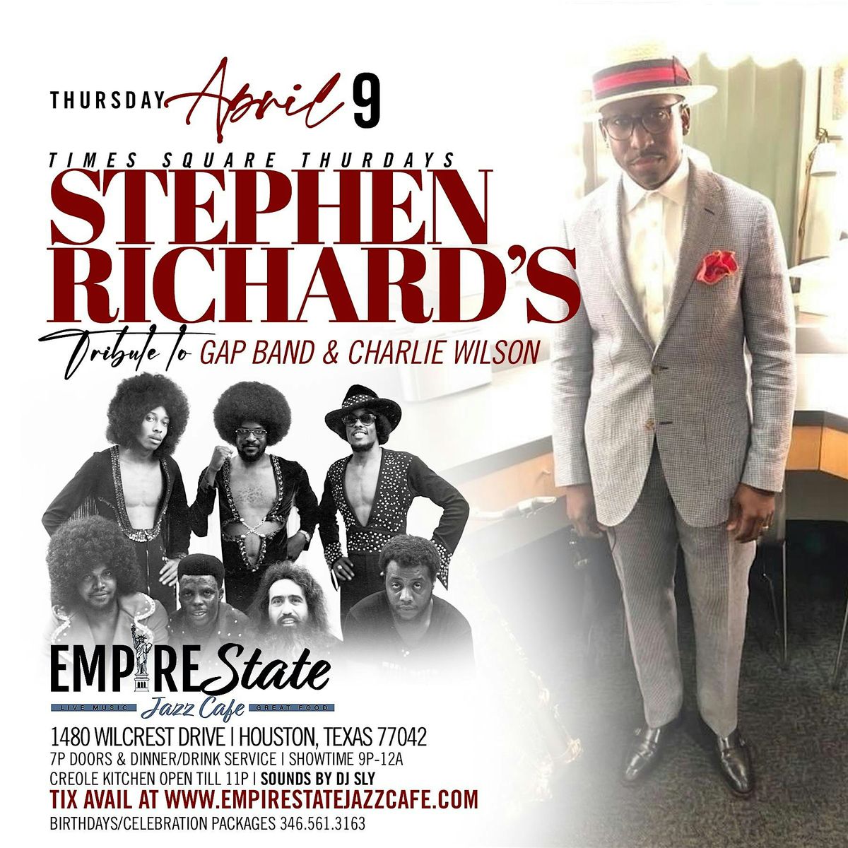 Come join us on 4/9 for Stephen Richard Thursday with The Gap Band & Charlie Wilson Tribute at Empire State Jazz Cafe.