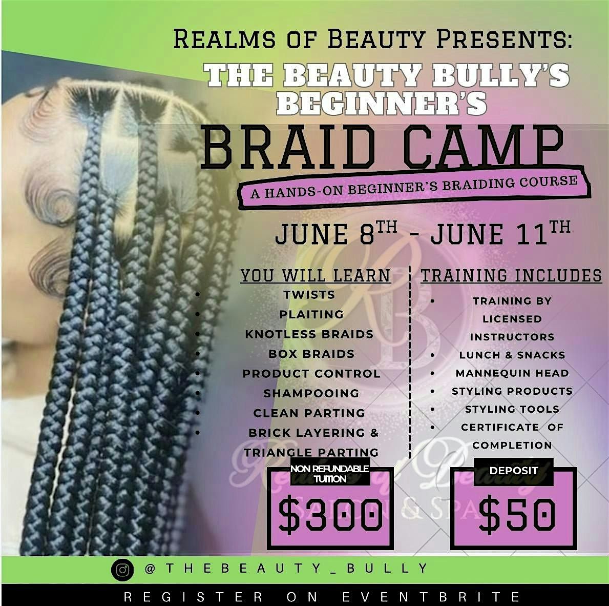 What are your summer plans? Plan to invest in yourself or your child by joining our week long Braiding class! In this course you will receive a braider’s kit & manual. You will learn to Twist, Braid, Box braid, Knotless braid, Triangle parting, Brick lay, Product control and Much more! Also at the end of this course you will earn a certificate of completion. Did we mention that lunch is included! This is great for licensed professionals needing continuing education credits as well! Once your $50 deposit is paid you will receive a welcome letter, a complete itinerary, and a list of class expectations. The remainder of $250 will be due by the start of class. Class hours will be Monday - Thursday 9-3.