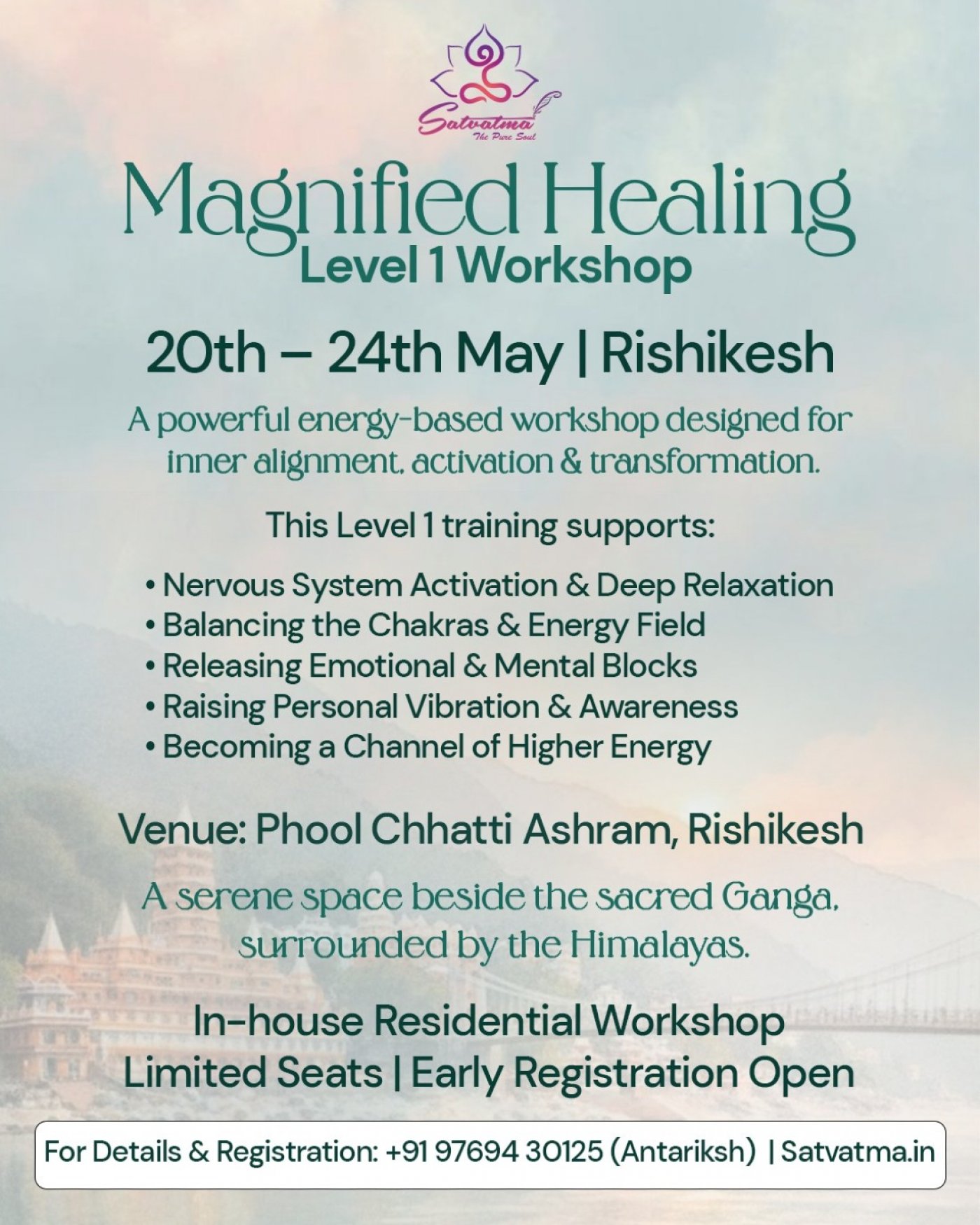 The Magnified Healing® Level 1 Workshop is a residential spiritual retreat designed to support deep inner alignment, emotional balance, and energetic purification in a calm and sacred environment. Held at Phool Chatti Ashram in Rishikesh, beside the holy river Ganga and surrounded by the Himalayas, this retreat offers participants the space to slow down, reconnect, and realign with their higher consciousness.