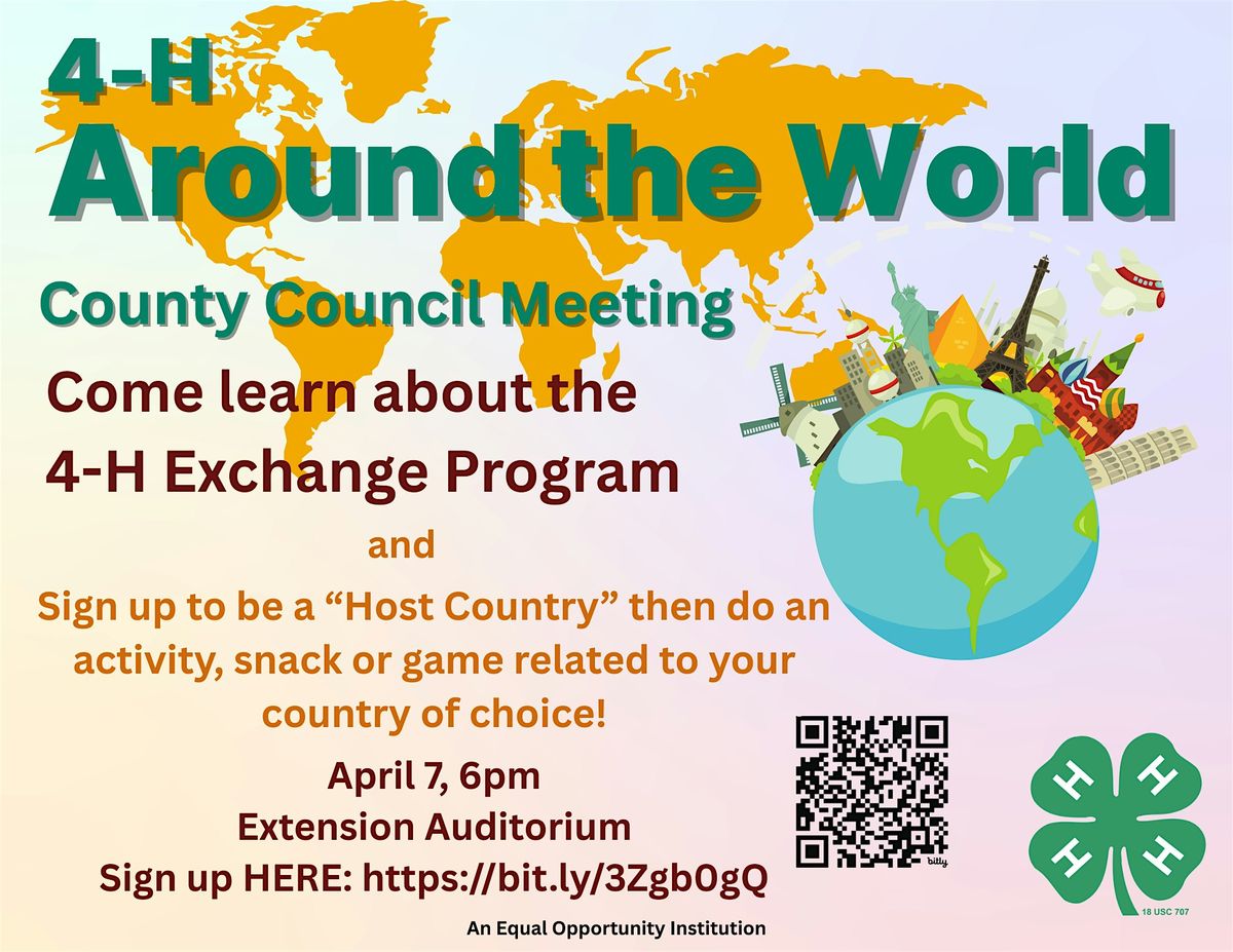 Our April 4-H Council meeting will focus on learning about cultures from around the world and learn about our 4-H exchange program. This Eventbrite is to RSVP for the event so we have a headcount for supplies.