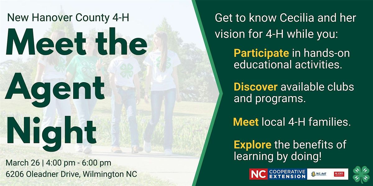 Are you looking for youth development opportunities in New Hanover County that mold the next generation into the leaders of tomorrow? Discover how 4-H helps youth "learn by doing" at our 'Meet the Agent' night!