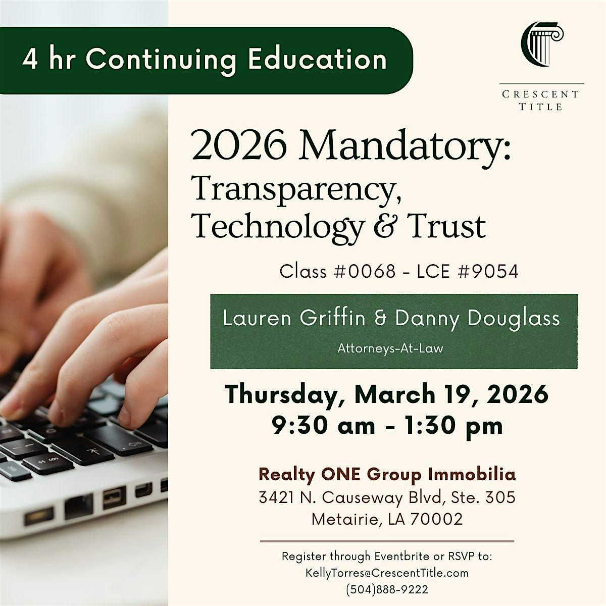 You are invited to a 4 hr CE event - 2026 Mandatory: Transparency, Technology & Trust on Thu March 19th from 9:30 am until 1:30 pm at REALTY ONE GROUP IMMOBILIA - 3421 N Causeway Blvd Ste 305 in Metairie.