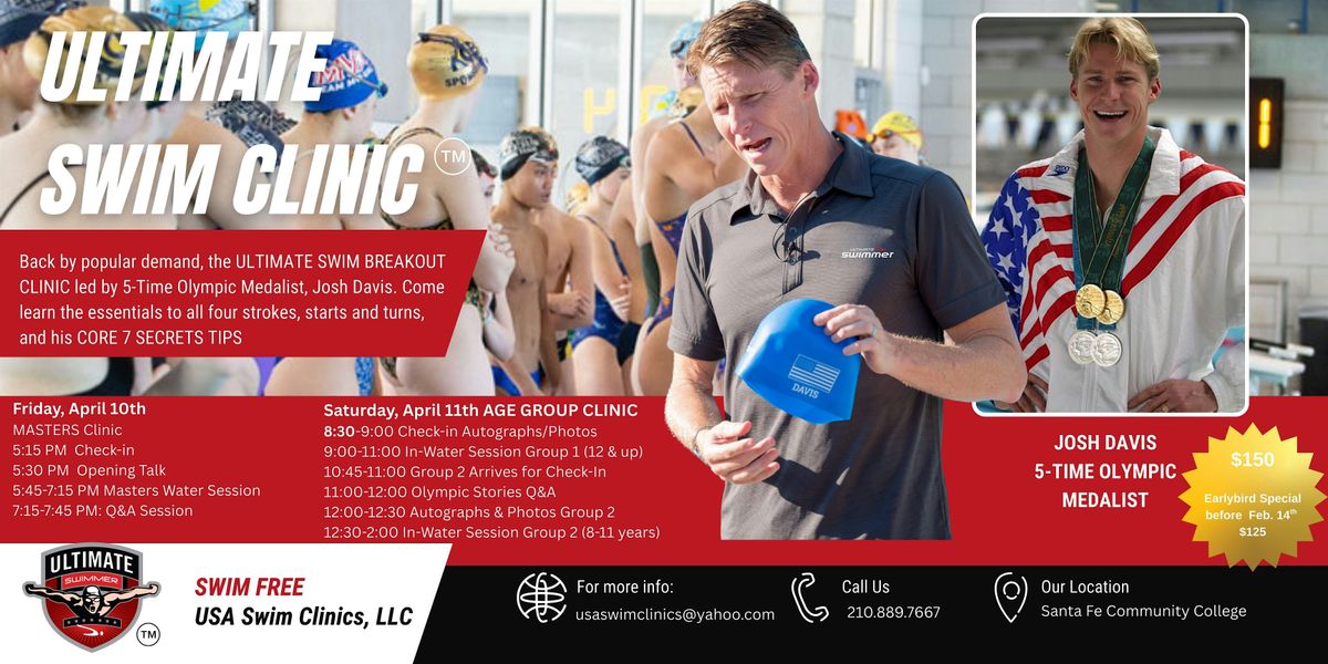 Join us for an extraordinary swim clinic with America's top swimming motivators, the legendary two-time Olympian, Josh Davis. This event will take place in Santa Fe, NM on Saturday, April 11th. Don't miss this unique opportunity to elevate your swimming skills and become a fast and happy swimmer.