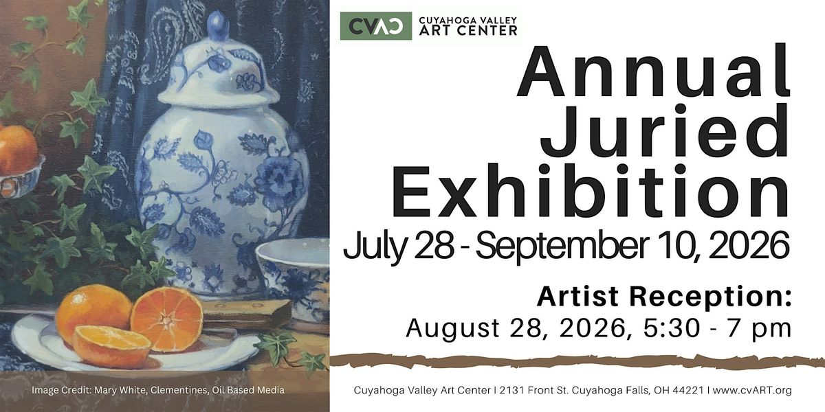 Cuyahoga Valley Art Center (CVAC) is proud to present its 41st Annual Juried Exhibition, a prestigious celebration of local artistic excellence, on display from July 28 to September 10, 2026. This highly anticipated exhibit features the impressive skills of local artists across seven unique categories: Watercolor Media, Water-Based Media, Oil-Based Media, Dry Media, Mixed Media, 3-Dimensional Media, and Photographic Media. With over $1,000 in prizes available, this exhibition is a testament to the creativity and skill within our vibrant art community.