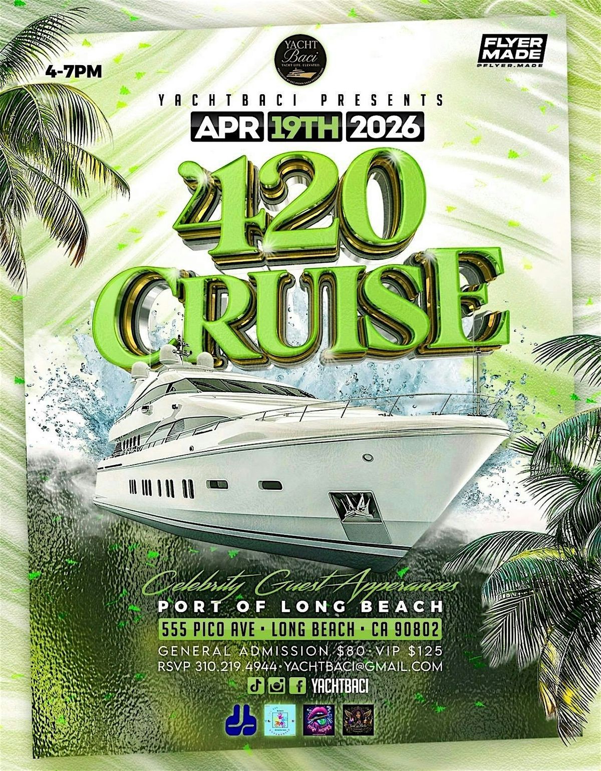 Get ready for an epic day out on the water with friends and good vibes. The 420 Cruise is your chance to kick back, relax, and enjoy an awesome in-person experience surrounded by great company. Whether you're here for the chill atmosphere or just to soak up the fun, this cruise promises good times all around. Don't miss out on this unique 420 celebration—set sail and make memories that will last!
