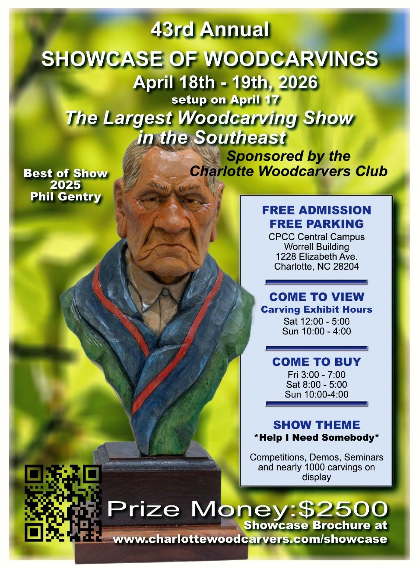 Come all to the 43rd Annual Showcase of Woodcarvings! This event is sponsored by the Charlotte Woodcarvers Club. Join us on Saturday, April 18th and Sunday, April 19th for this FREE EVENT at the Worrell Building for a weekend filled with incredible craftsmanship and creativity. Witness talented woodcarvers from all around showcasing their finest pieces. Don't miss out on this opportunity to meet and speak with woodcarvers to learn about the art of woodcarving. Come shop the vendors, attend seminars, enter the raffle, enter competitions and win your share of $2500 in prize Money! Public Carving Exhibit hours on Saturday, April 18 are from 12 pm to 5 pm, but doors open early at 8 am for Vendor sales, seminars, raffle and silent auctions. Sunday, April 19 Public Carving Exhibit hours are from 10 am to 4 pm.