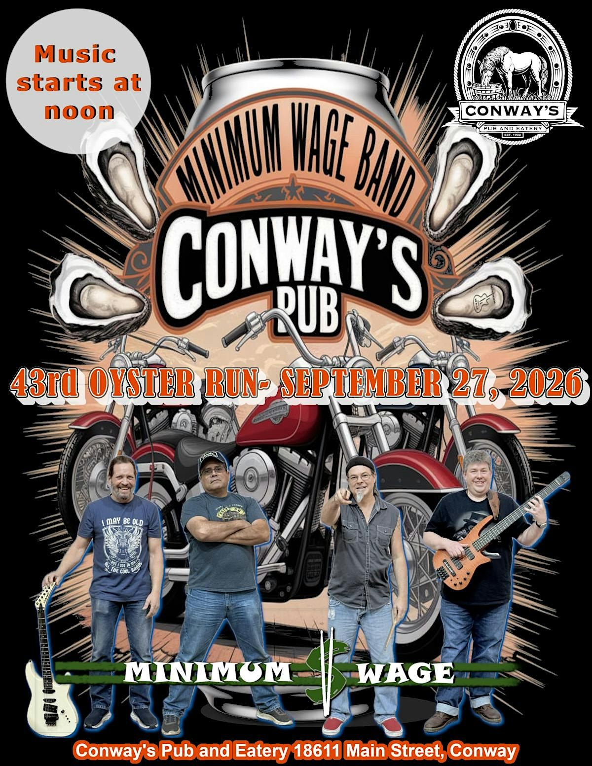 Join us for an awesome night with Minimum Wage Band rocking the house at Conway's Pub and Eatery. It's an in-person event filled with great vibes, cool tunes, and good company. Come hang out, enjoy the music, and make some unforgettable memories. Don't miss out!