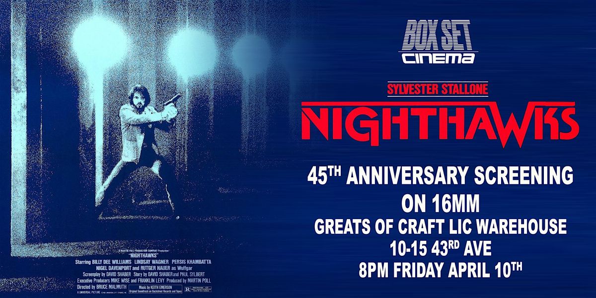 Box Set Cinema's 45th Anniversary 16mm screening of NIGHTHAWKS starring Sylvester Stallone & Rutger Hauer. Ticket includes 1 drink & zine.About this Event