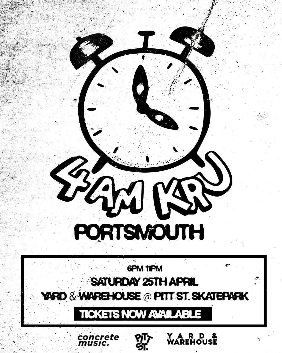 Concrete Music Presents: 4am KruSaturday 25th April | 3pm-11pmYard & Warehouse @ Pitt St. SkateparkPortsmouth--------------------One of the most exciting acts in the scene, 4am Kru bring their live Jungle beats to Yard & Warehouse / Pitt st. Skatepark, Portsmouth April 25thSupport TBCDisclaimer: