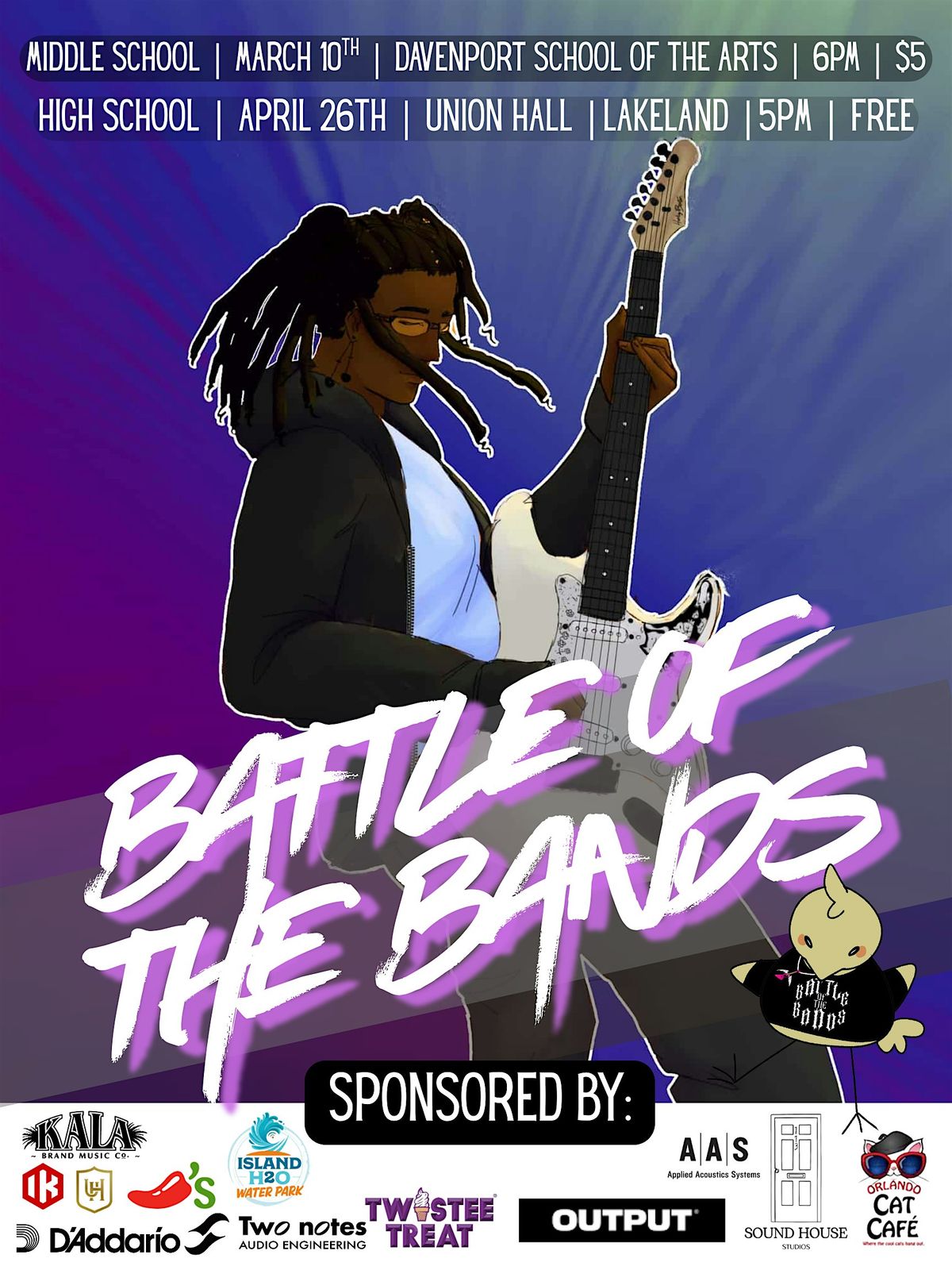 The 4th annual battle of the bands takes place at Union Hall with 14 high school bands performing multiple genres for three different titles: best original act, best cover act, and best in show. Participants are judged not only on technical knowledge but also on stage presence and originality of material. They can win prizes such as gear, plug ins, and recording time! This is a free event and ALL AGES! Bring the fam, take pictures, grab a bite from the food truck, and a mocktail!