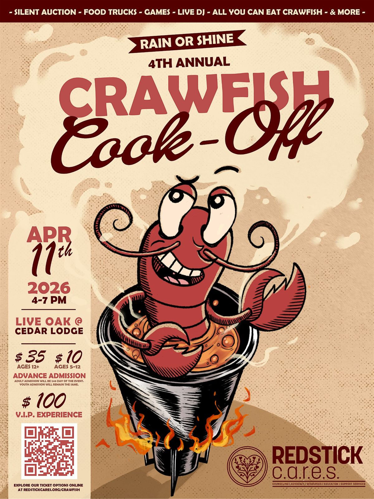 Please note that we are only selling General Admission tickets here. For VIP options and information about our Sponsorship tiers and Boiler opportunities, please check out our website at https://www.redstickcares.org/crawfish.