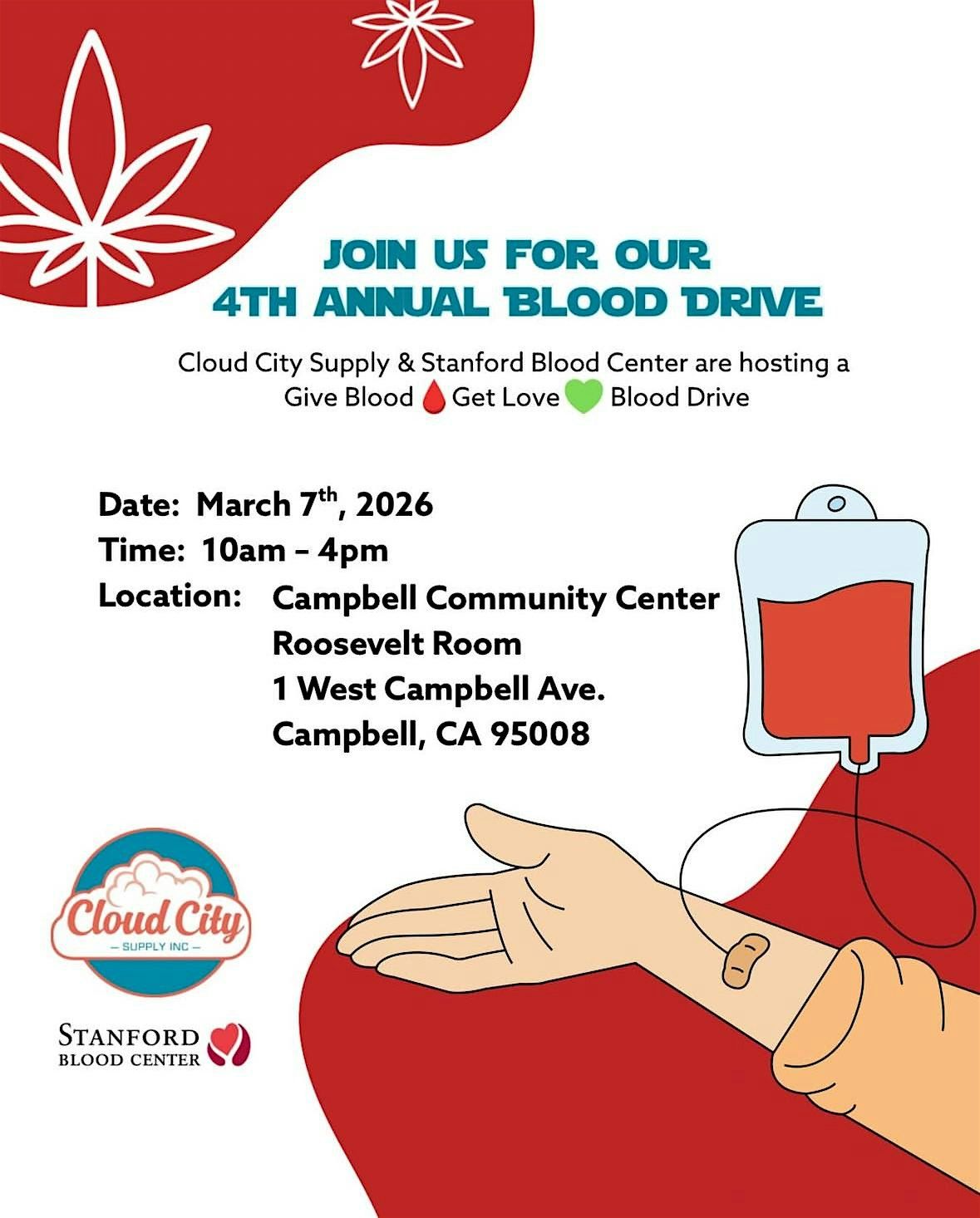 Give Blood, Get Love ❤️ Join Cloud City Supply & Stanford Blood Center on March 7, 10am–4pm at Campbell Community Center.About this Event
