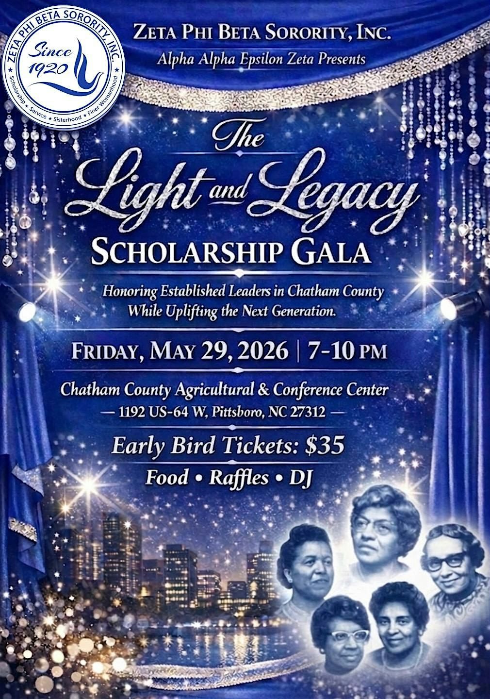 The Ladies of the Alpha Alpha Epsilon Zeta Chapter of Zeta Phi Beta Sorority, Incorporated (Pittsboro) would like to extend a warm invitation for you to join us at our 4th Annual Light & Legacy Scholarship Gala to benefit the AAEZ Scholarship Fund on Friday, May 29, 2026.