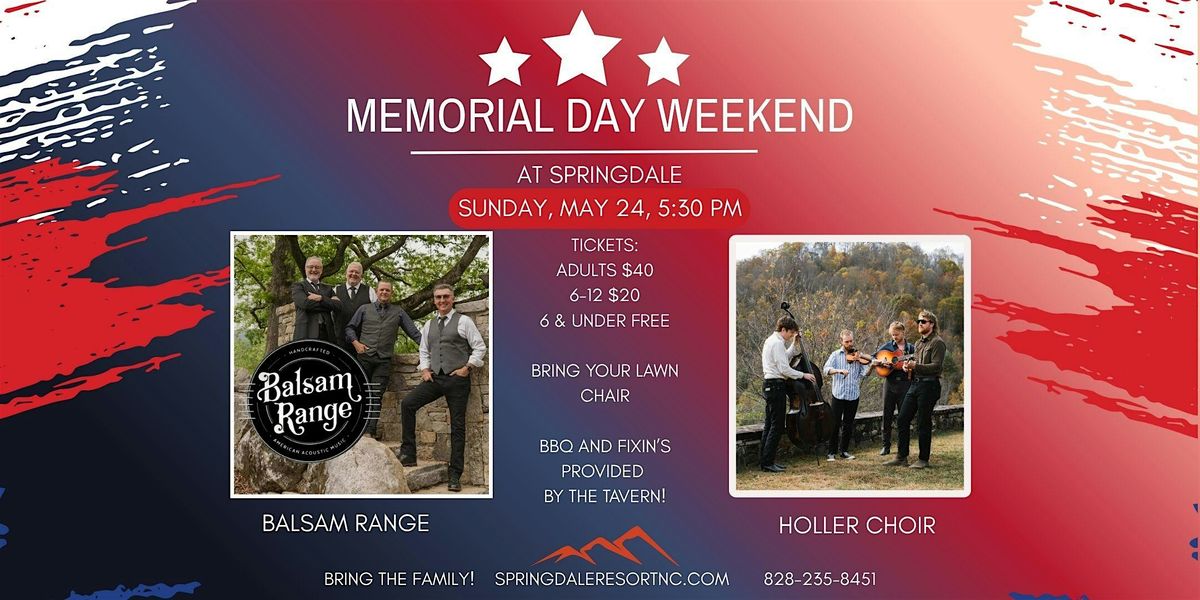Headlining the evening is Balsam Range, one of the region’s most celebrated bluegrass bands, joined by rising artist Holler Choir. Set against the backdrop of Springdale’s scenic mountain views, this outdoor concert delivers a one-of-a-kind experience blending music, community, and the natural beauty of Western North Carolina.