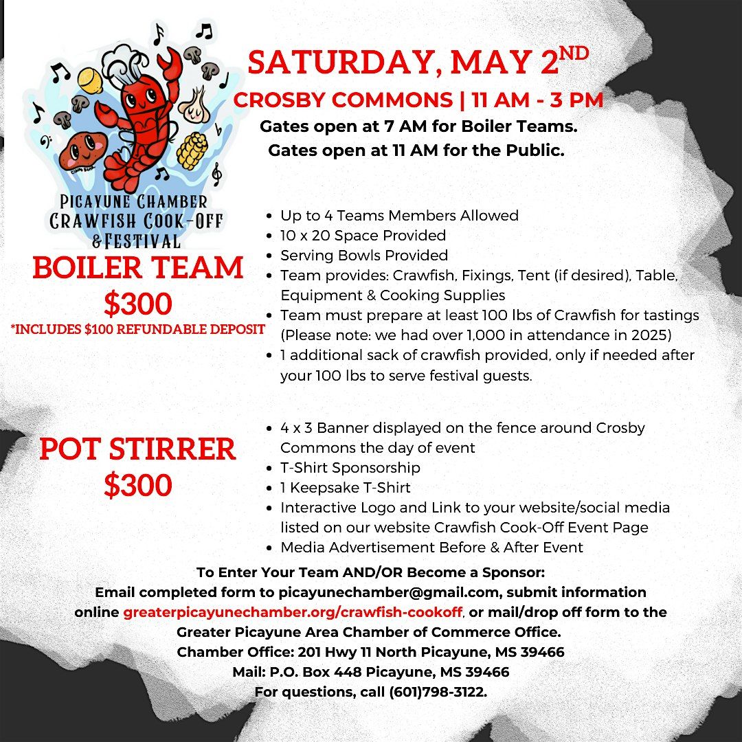 Ready, Set, Boil! Join the Greater Picayune Area Chamber of Commerce for an event like no other on Saturday, May 2nd! Who Cooks The Best Crawfish ? PEOPLES CHOICE AND JUDGES CHOICE! Also a prize for best fixings. Live music, cornhole and bounce houses/obstacle course for the kids.