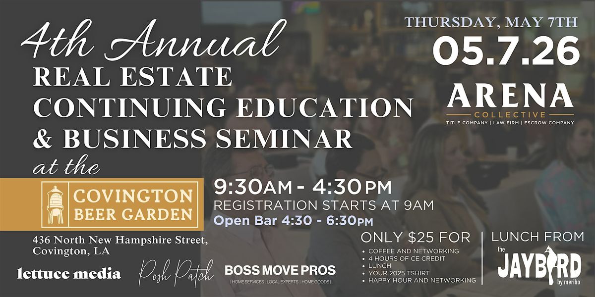 Welcome to the Fourth Annual Real Estate Continuing Education & Business Seminar! Join us for a day of learning, networking, and fun at Covington Beer Garden. This in-person event will take place on Thu May 7th 2026 with registration starting at 9:00AM. The first speaker begins at 10AM .