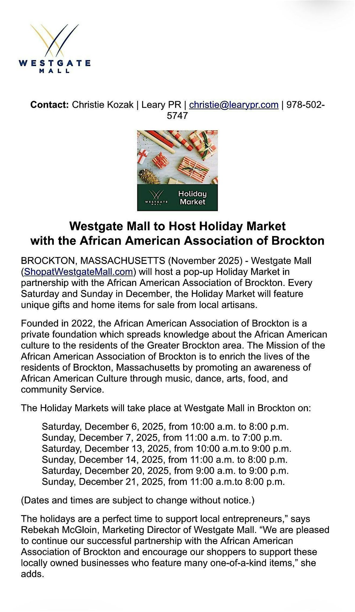 Join us for the 4th Annual Toy Giveaway & Holiday Market, hosted by the African American Association of Brockton and the Westgate Mall
