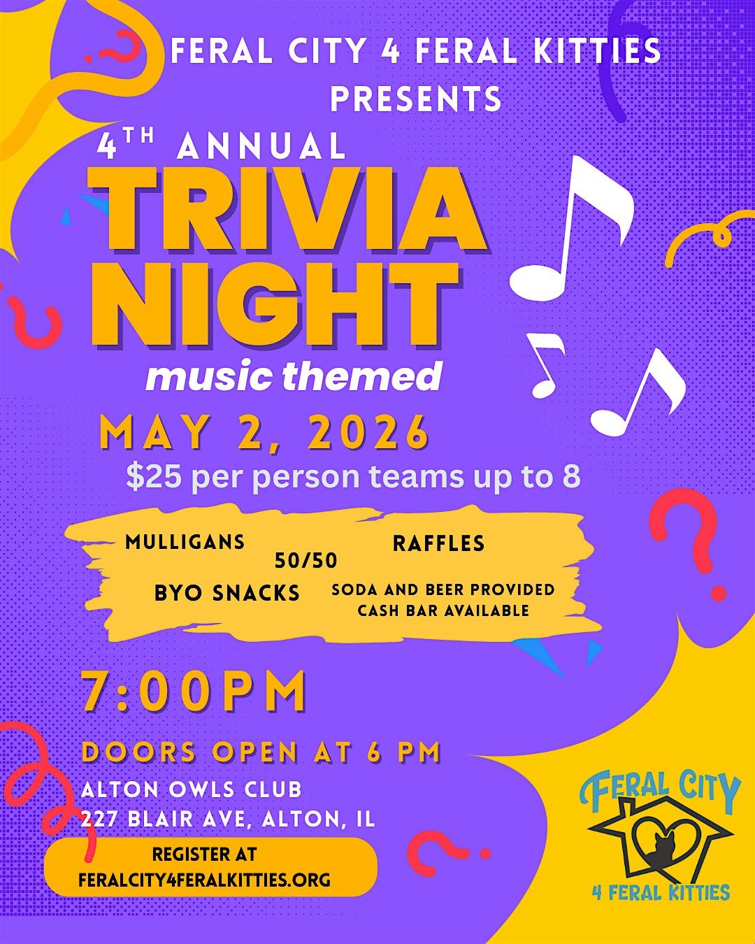 Come help support our kitties while enjoying a night of music trivia. Doors open at 6 PM. We will have raffles and silent auction. Soda, beer, and popcorn provided, bring your own snacks. Cash bar available. No outside drinks allowed. You may visit our website or find us on Facebook. Tables fit up to 8 comfortably, although there are a few small tables if you prefer to have a small team. Tickets are $25 per person. Cash prize for 1st and 2nd place as well as a trophy.