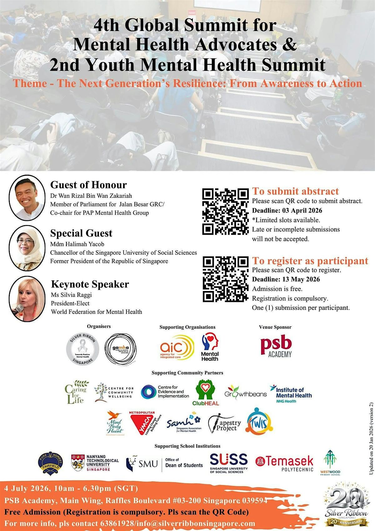 Welcome to the 4th Global Summit for Mental Health Advocates and 2nd Youth Mental Health Summit! Join us July 04, 2026, 10AM (Asia/Singapore) for a day filled with insightful discussions, workshops, and networking opportunities. This event aims to bring together mental health advocates from around the world and youth leaders to collaborate and drive positive change in our communities. Don't miss out on this unique opportunity to connect with like-minded individuals and make a difference!