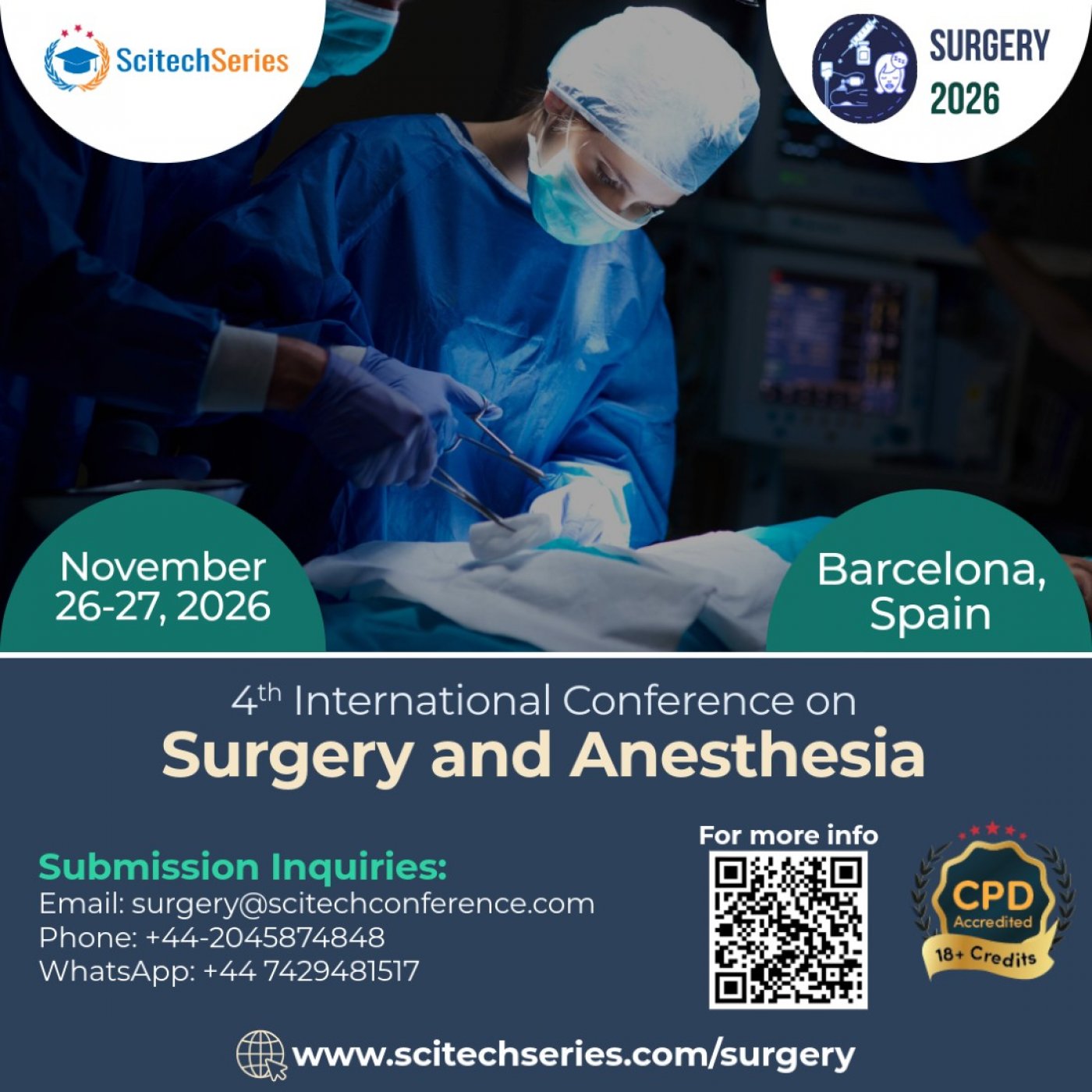We are delighted to extend a cordial invitation to the “4th International Conference on Surgery and Anesthesia” (Surgery 2026), scheduled as a Hybrid Event during November 26-27, 2026 in Barcelona, Spain.