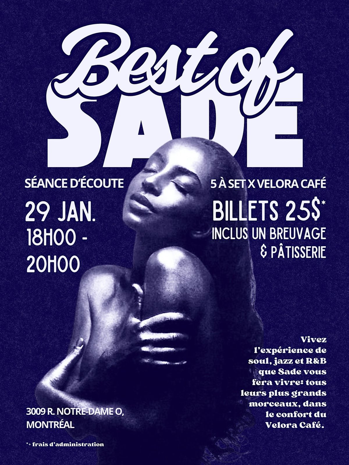 Plongez dans l’univers du groupe britannique et de ses influences de jazz, R&B et soul. Peu importe votre âge, nous sommes certains que Sade a eu une influence sur votre palette musicale. Joignez-vous à nous au Velora Café , dans une ambiance chaleureuse et découvrez les excellents breuvages et pâtisseries que Velora a à offrir, tout en savourant une compilation des plus grands classiques de Sade.