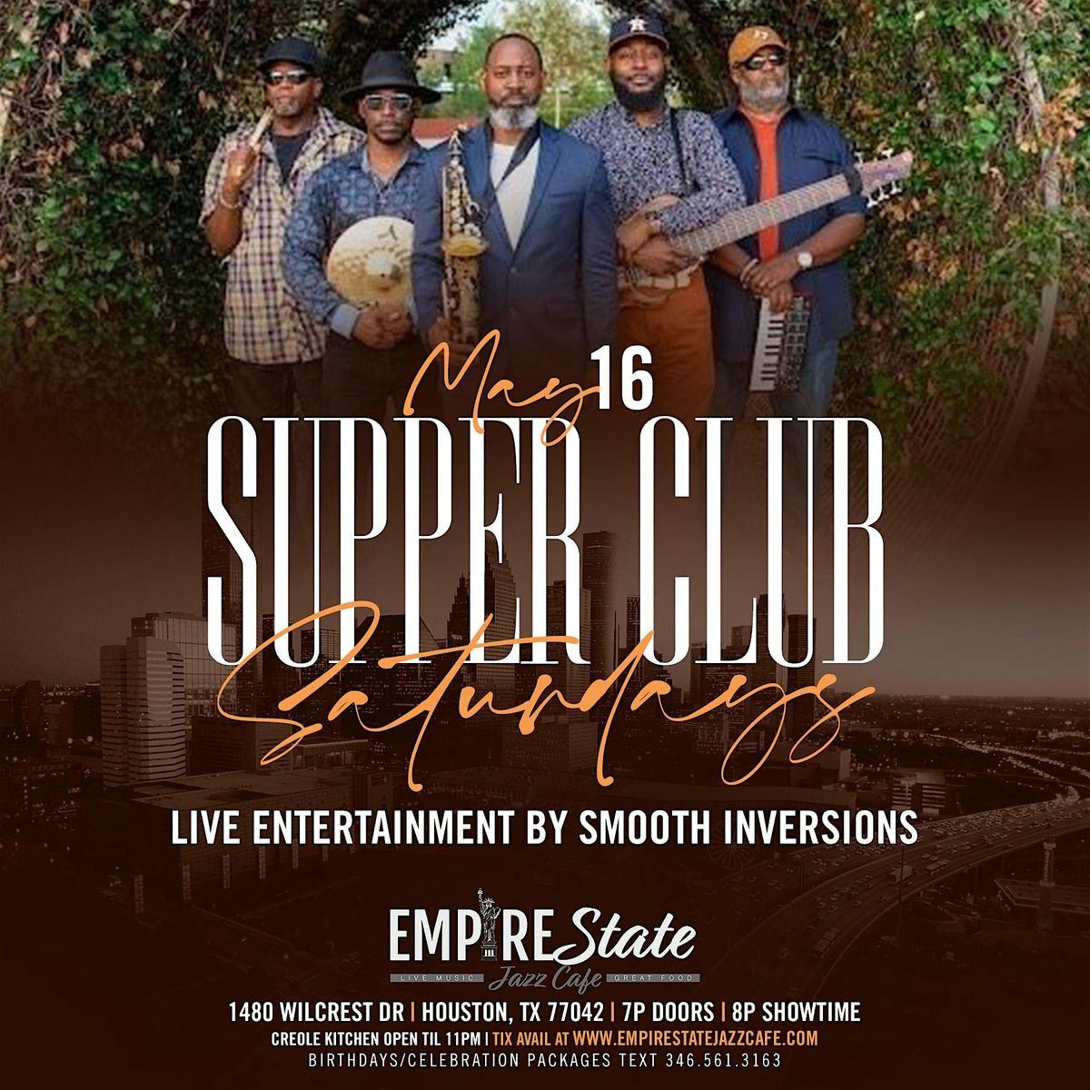 Join us at the Empire State Jazz Cafe for a chill night of smooth tunes and good vibes. On May 16, 2026 at 7:00 PM | Show 8:00 PM (Central Time), kick back with friends and enjoy the sounds of Smooth Inversions. Perfect way to spend your Saturday evening with great music and even better company. Don’t miss out on this laid-back jazz experience!