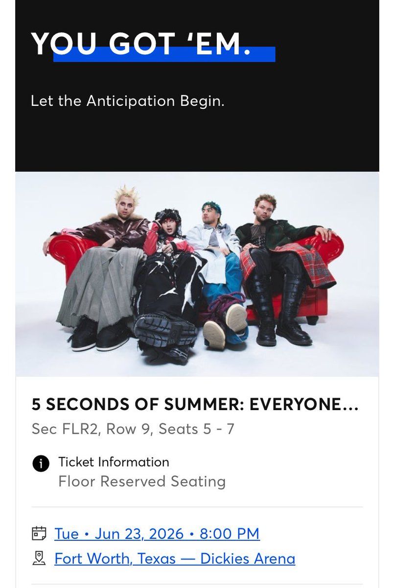 5 Seconds of Summer at Dickies Arenaπ Welcome to 5 Seconds of Summer Fort Worth Tickets, where dreams come alive and possibilities are endless! ποΈ Join us at Dickies Arena in the heart of Fort Worth, TX for an event that defies expectations. π