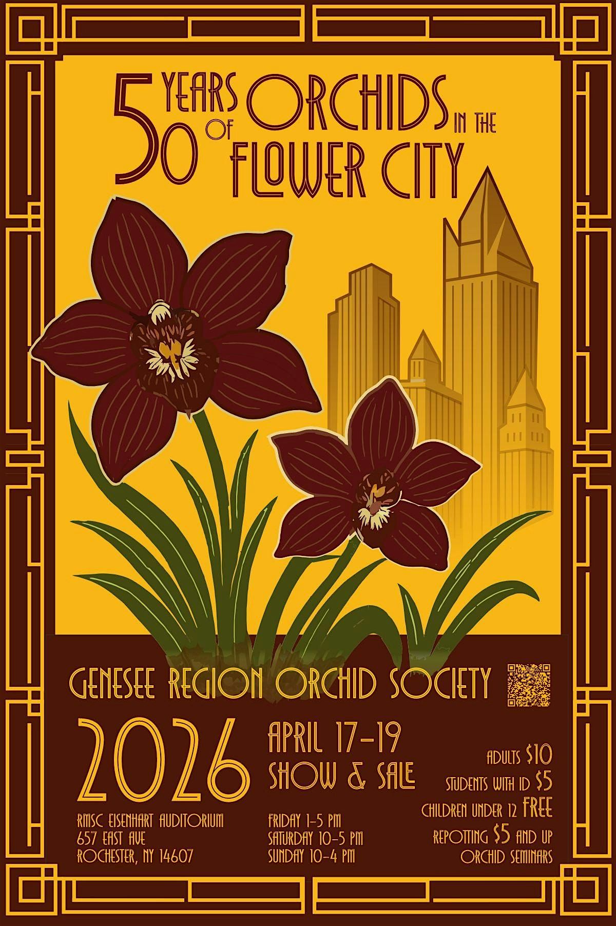 Genesee Region Orchid Society's 50th Show and sale is a 3 day event for viewing, shopping and learning about Orchids. Over a half dozen vendors selling Orchids, supplies and even jewelry made with real orchids including Bergen Water Gardens, Windswept in time, Oakwood Orchids, J&L Orchids, Flask & Flora, and more. Arouse your senses by viewing and smelling exhibits of magnificent blooming orchids by vendors, local members and surrounding organizations. As well as exhibits by our local Ikebana International Rochester and Bergen Bog. Bring in your pot bound orchids and have them repotted by our experts for a small fee. Various orchid talks take place throughout the day on Saturday and Sunday. Adults $10, Students with ID $5, children under 12 Free. Friday 1-5pm, Saturday 10am-5pm, Sunday 10am-4pm. To learn more about the show or to exhibit your own orchids or orchid related work, visit the website. https://www.geneseeorchid.org/annual-orchid-show/