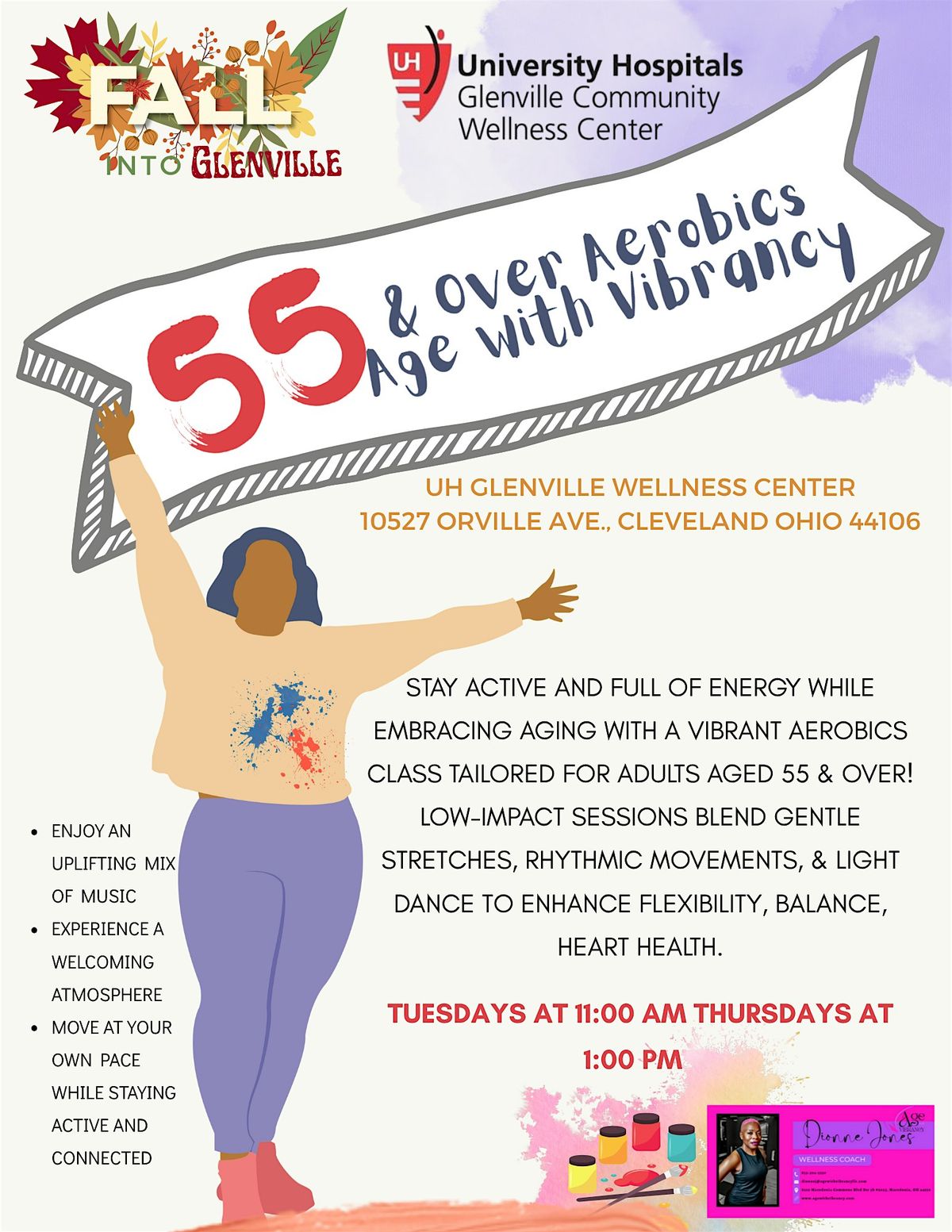This low-impact class combines gentle stretches, rhythmic movement, and light dance to improve flexibility, balance, and cardiovascular health. Set to an enjoyable mix of music, offers a welcoming environment where you can move at your own pace while staying active and connected. Dionne Is a certified fitness instructor who encourages movement with low impact classes that are self-paced.