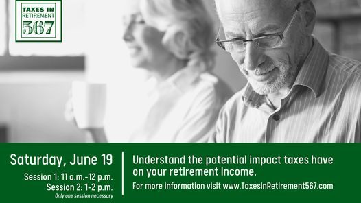 This free event is open to the public. For more information and to register for this event, go to TaxesInRetirement567.com or call 844-567-7760.