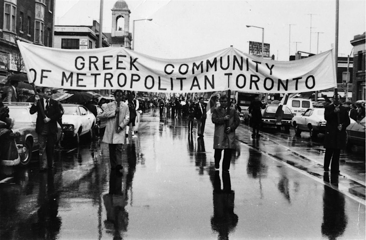 Photo Banner: Mantalas, Dimitris. "Parade in rain on Danforth Avenue between Gough Avenue and Carlaw Avenue." Dimitris Mantalas fonds, ASC02534. Clara Thomas Archives & Special Collections, York University Libraries, Toronto, ON.https://digital.library.yorku.ca/dimitris-mantalas-fonds/parade-rain-danforth-avenue-between-gough-avenue-and-carlaw-avenue.