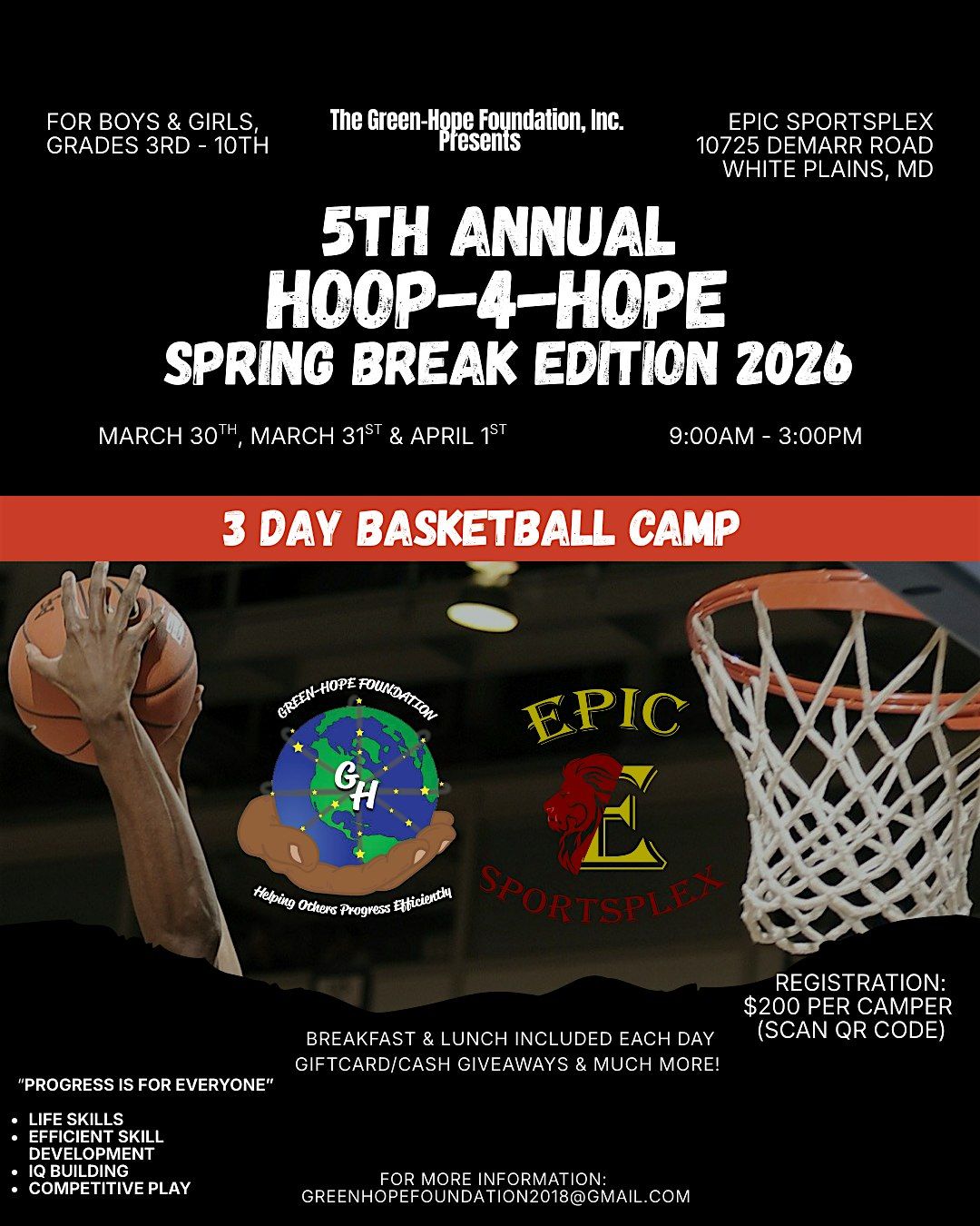 This camp is THREE DAYS ( Monday, March 30th - Wednesday, April 1st @ 9:00am - 3:00pm EACH DAY) and will consist of fundamental and Elite skill work and competitive contest amongst the campers. The camp will also include breakfast, lunch, Hoop-4-Hope wristband, giftcards & givaways. Each camper will have the opportunity to win a trophy or cash prize.