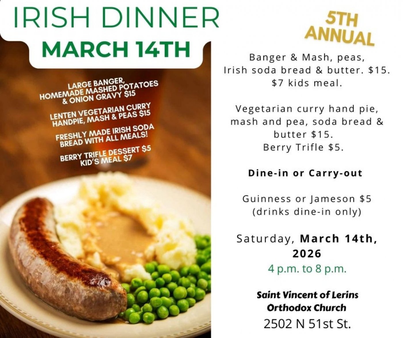 5th Annual Irish Dinner Fundraiser featuring an authentic Irish meal with bangers and mash! Everything is homemade! Banger & Mashed Potatoes with buttered peas, homemade