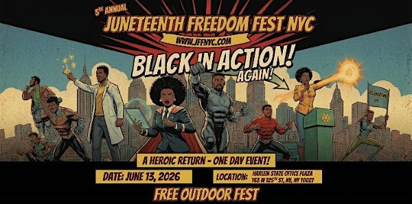 Welcome to the 5th Annual Juneteenth Freedom Fest NYC! Get ready for a day filled with celebration, empowerment, and community at the Adam Clayton Powell Jr State Office Building Plaza. Join us as we honor our past, celebrate our present, and look forward to our future with the theme Black In Action. This in-person event will feature live performances, give-aways, local vendors, and much more. EVERYONE THAT PRE-REGISTERS & FOLLOWS JFFNYC ON IG & FACEBOOK WILL BE AUTOMATICALLY ENTERED INTO A RAFFLE TO RECEIEVE A FREE JUNETEENTH MERCH PACKAGE! (Must RSVP & Be Present at our outdoor fest to reciece prize!)Don't miss out on this incredible opportunity to come together and commemorate this important day in history. See you there!