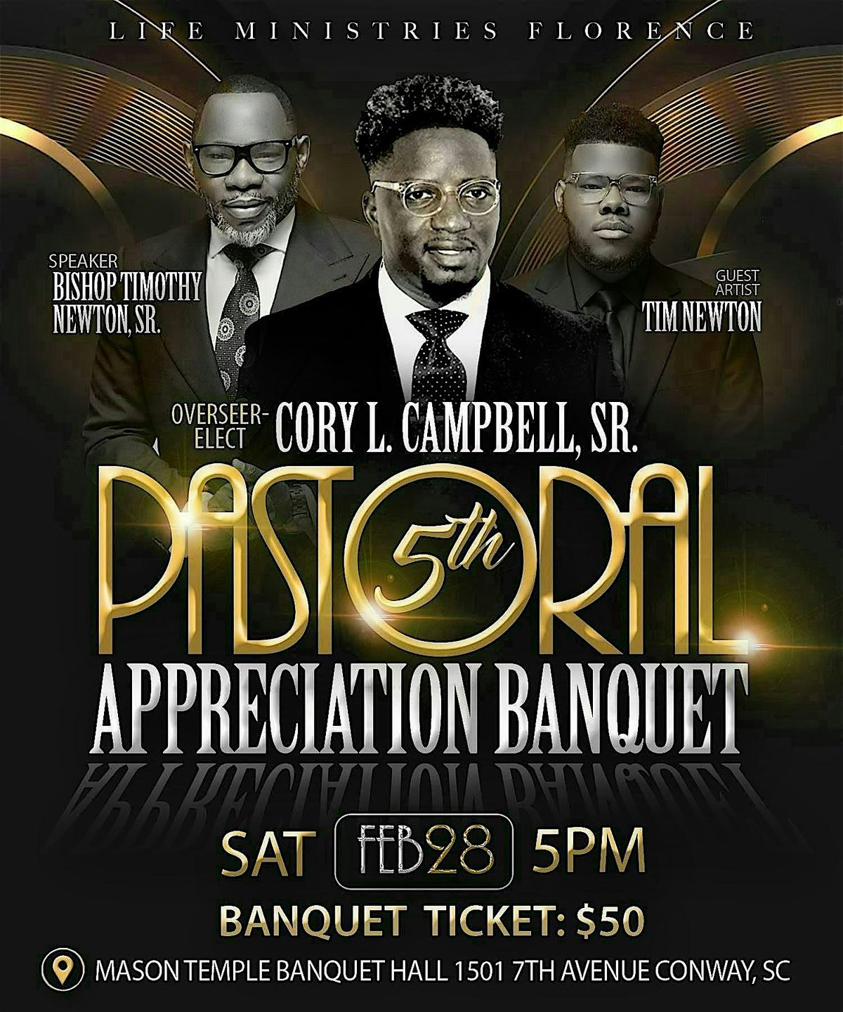 Join us in celebrating and appreciate our amazing pastor Overseer-Elect Corey L. Campbell, Sr. at the 5th Pastoral Appreciation Banquet!