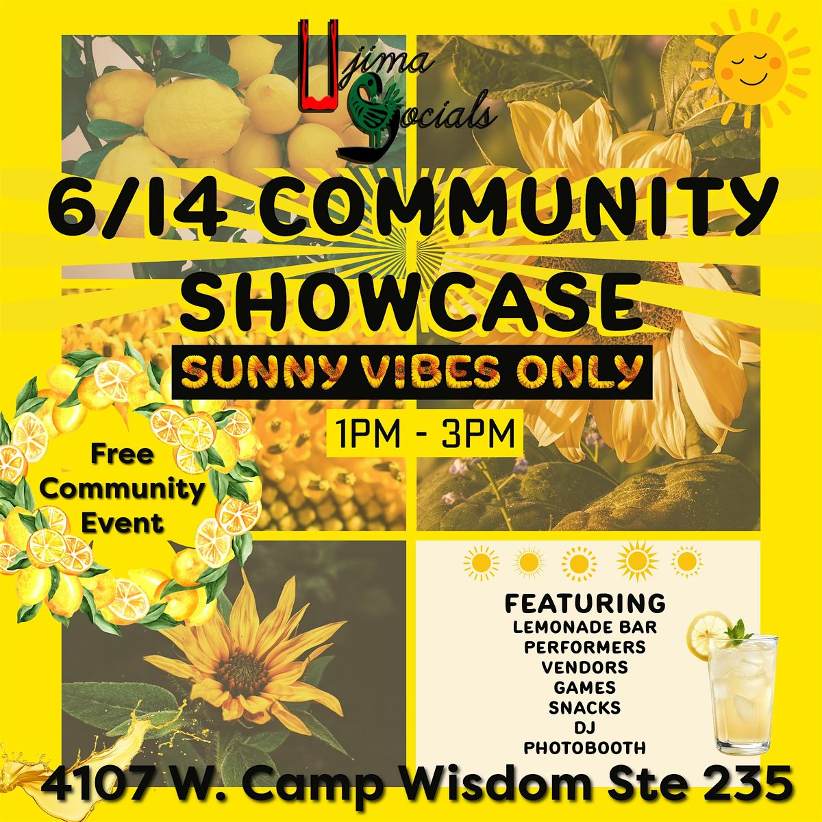 Come join us for a fun-filled Community Showcase event on June 14th. We will celebrate Sunny Vibes Only with our lemonade bar. The Community Showcase highlights the amazing talents and skills of our local community members. From interactive displays to musical performances, there will be something for everyone to enjoy. Our DJ, King Shakur, will keep the energy high while our local vendors share a diverse array of information and products. This free event will be held at 4107 W Camp Wisdom Rd ste 235, so mark your calendars and bring your friends and family along. Let's celebrate the diversity and creativity of our community together! Free raffle tickets and swag bags available while supplies last.