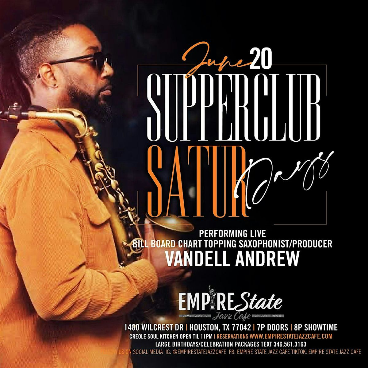 Welcome to Supper Club Saturdays with Vandell Andrew at Empire State Jazz Cafe! Join us on June 20, 2026 at Doors 7:00 PM | Show 8:00 PM for a night of smooth jazz and delicious food. Vandell Andrew will be serenading us with his amazing saxophone skills, creating the perfect ambiance for a Saturday evening.