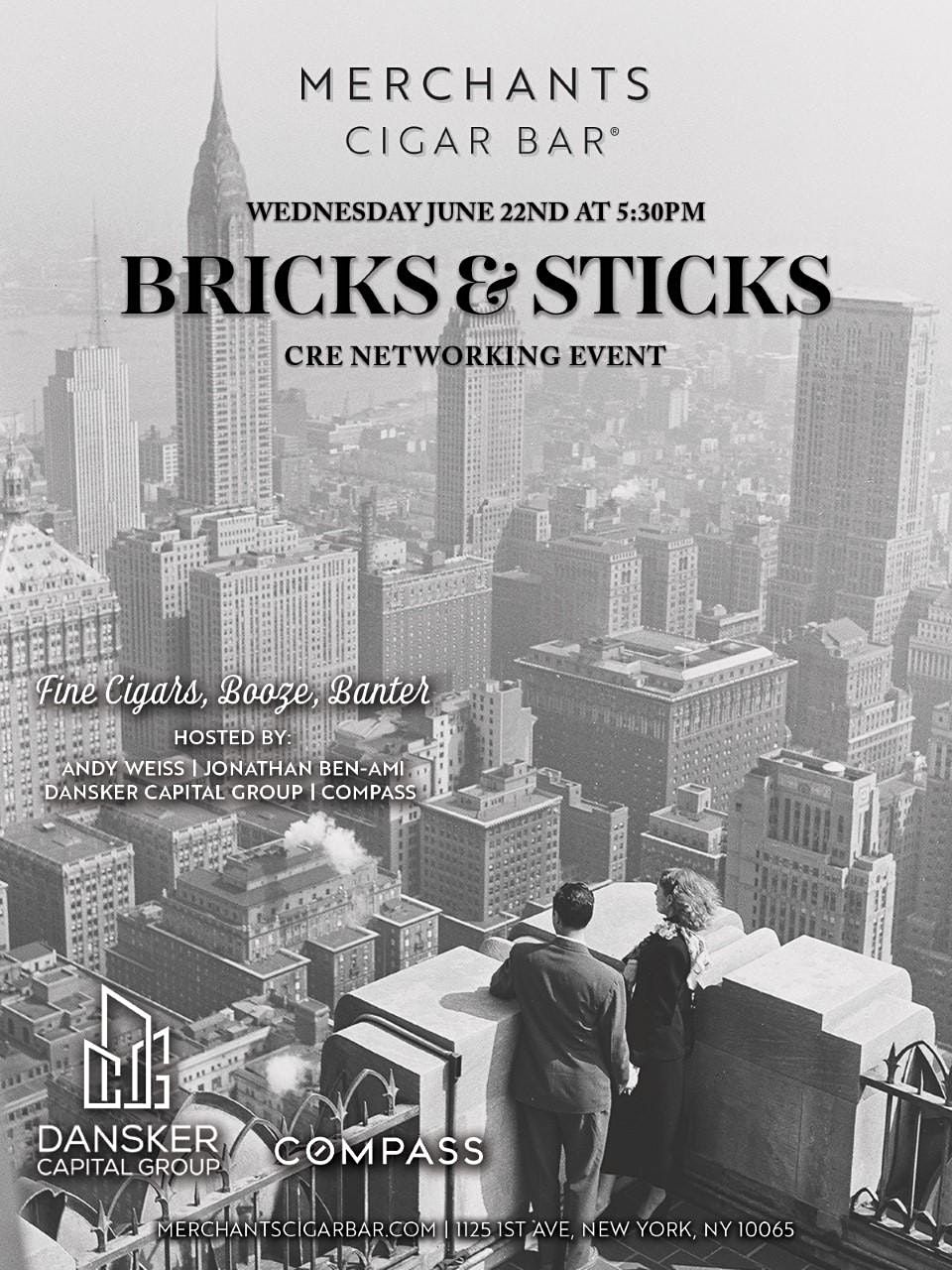 Wednesday, June 22, Join NYC's Top CRE Professionals at Merchants Cigar Bar - NYC's Premier Cigar & Cocktail Lounge nestled on the Upper East Side for Bricks & Sticks.