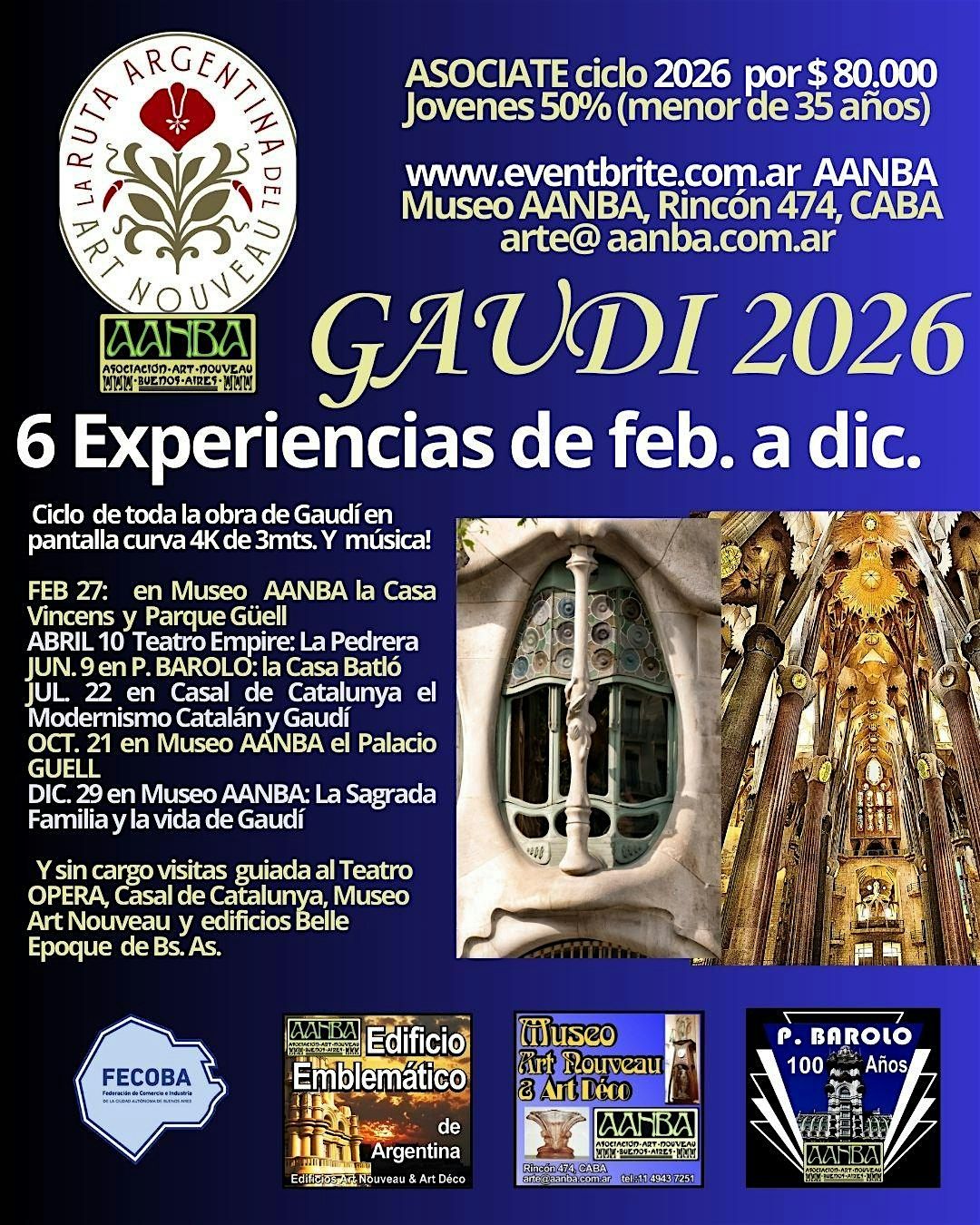 PROMO 6 actividades del gran "CICLO 2026 GAUDI " de AANBA, de feb. a dic. 2026, 6 Experiencias sobre la obra del genio de Barcelona en su 100° Aniversario. Visitas, Galas, Festejos, espectáculos o Cocktails, en el T. Opera, Museo Art Nouveau AANBA, Palacio BAROLO, Casal de Catalunya y otros palacios o tesoros de la Belle Epoque de Bs. As. Los 6 eventos 2026 que se realizaran (como mínimo, ver al final otros programados a confirmar) promo enero por solo $ 80.000 con el desc. incluido: