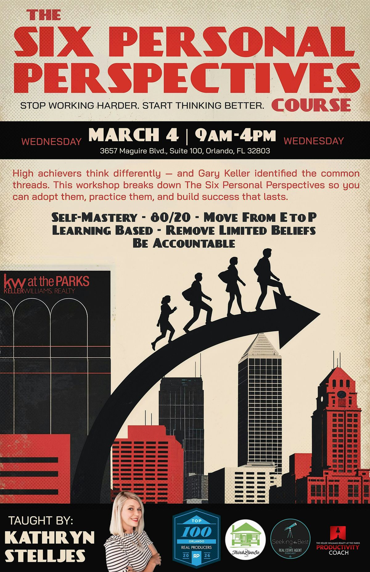 Taught by Kathryn Stelljes with Keller Williams Realty at the Parks. Top 100 Agent in Central Florida in 2025, Productivity Coach for Keller Williams Realty at the Parks, 20 Under 40 for Orlando Regional Realtors Association, Host of the Podcast Seeking the Best. Kathryn has been selling homes for19 years helping clients and agents build momentum through mindset, focus, and simple, repeatable habits. An educator at heart, Kathryn teaches practical KWU-based strategies that translate directly into better decisions, stronger consistency, and a career worth having.