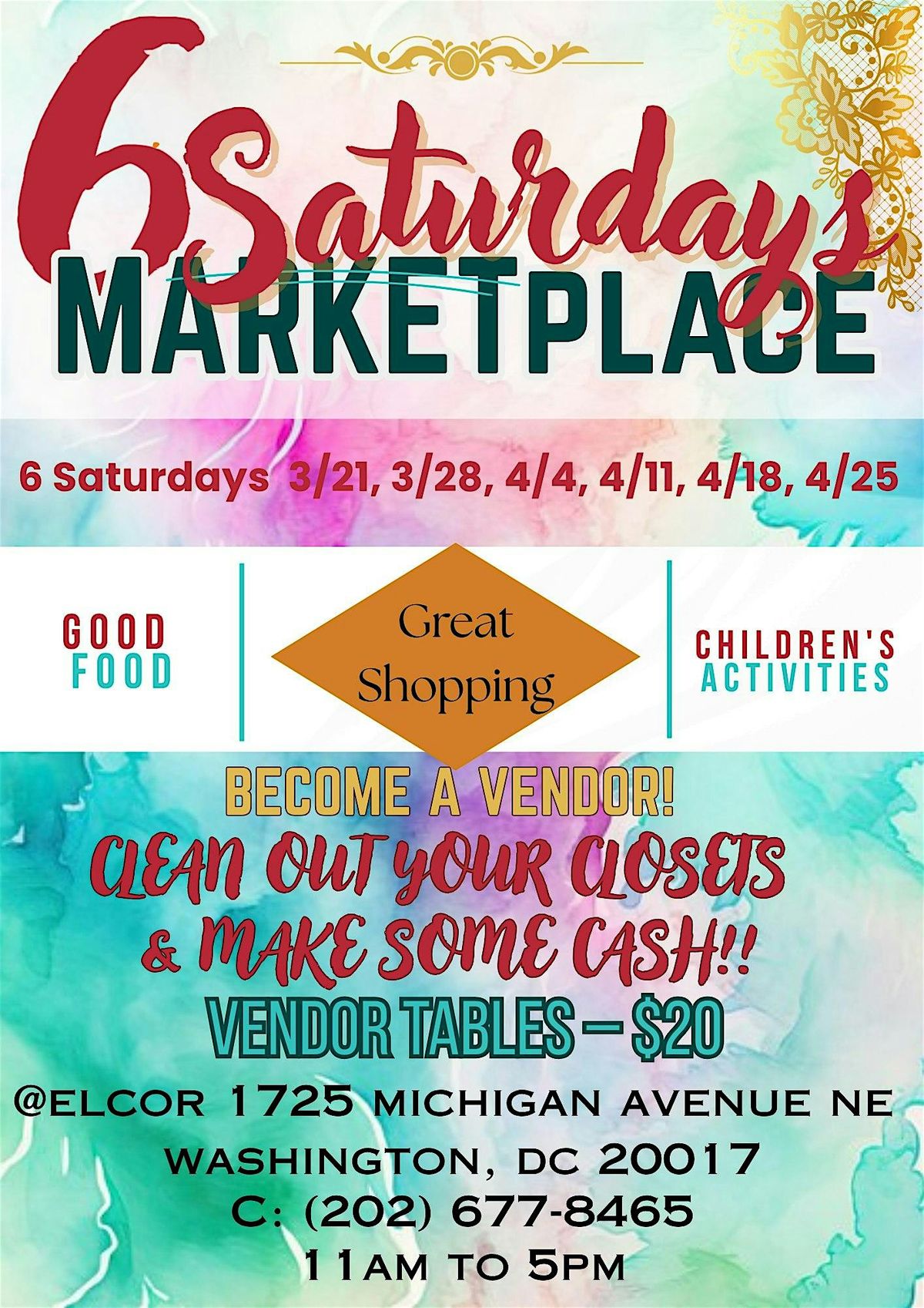 6 Saturdays Marketplace: shopping, food & kids activities. Mar 21–Apr 25, 11AM–5PM, 1725 Michigan Ave NE DC. Call 202-677-8465. ️