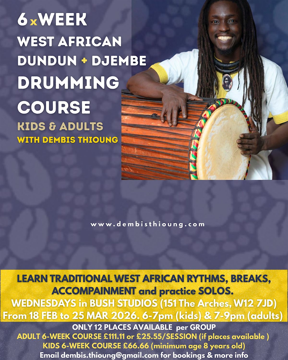 DEMBIS THIOUNG will be offering a 6-week a West African Dundun + Djembe drumming course, starting Wednesday 18 February at BUSH STUDIOS in Shepherd’s Bush