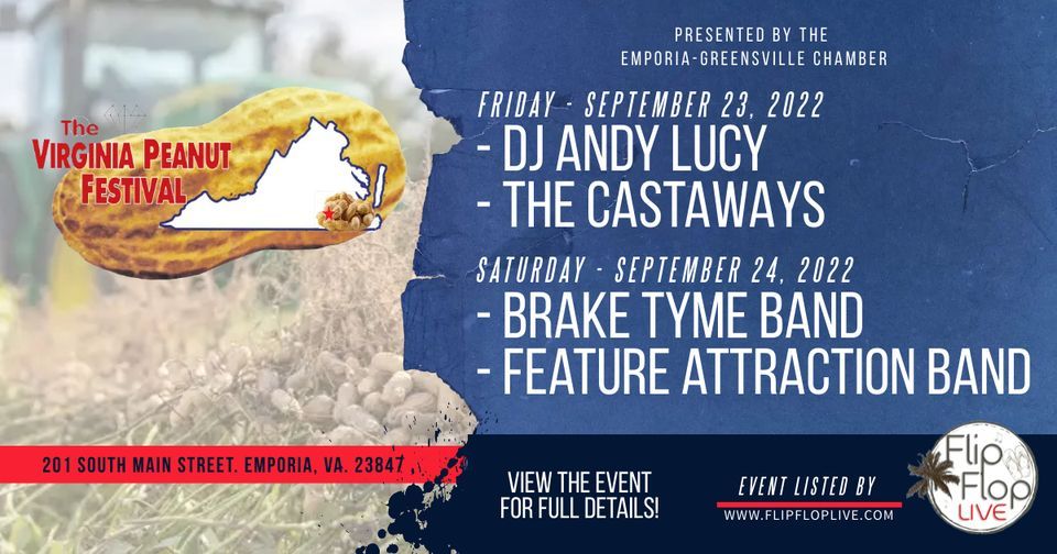 The 60th Annual Virginia Peanut Festival at Veterans Memorial Park in Emporia, Virginia. A three day event held in downtown Emporia. Friday night it's DJ Andy Lucy from WEVA 860AM and Flip Flop Live Radio and The Castways!