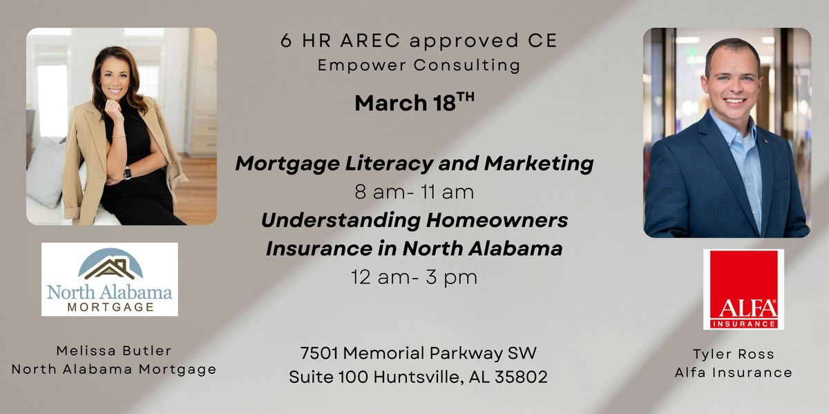 Get ready for an in-person session all about Mortgage Literacy and Homeowners Insurance in beautiful North AL. This 6-hour continuing education event is perfect for boosting your knowledge and sharpening your marketing skills. Whether you're new or seasoned, come connect, learn, and grow with industry pros. Don’t miss out on this hands-on opportunity!