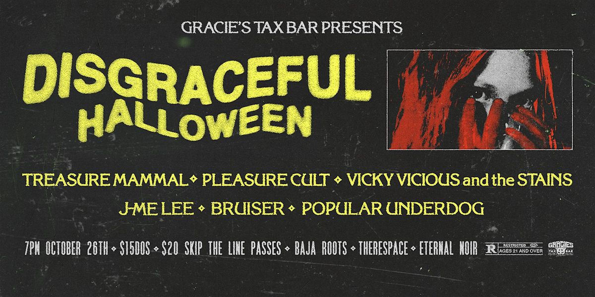 6th Annual Disgraceful Halloween with bands Treasure Mammal, Pleasure Cult, & Vicky Vicious, plus DJ's JME-LEE, Briv, & Popular Underdog.