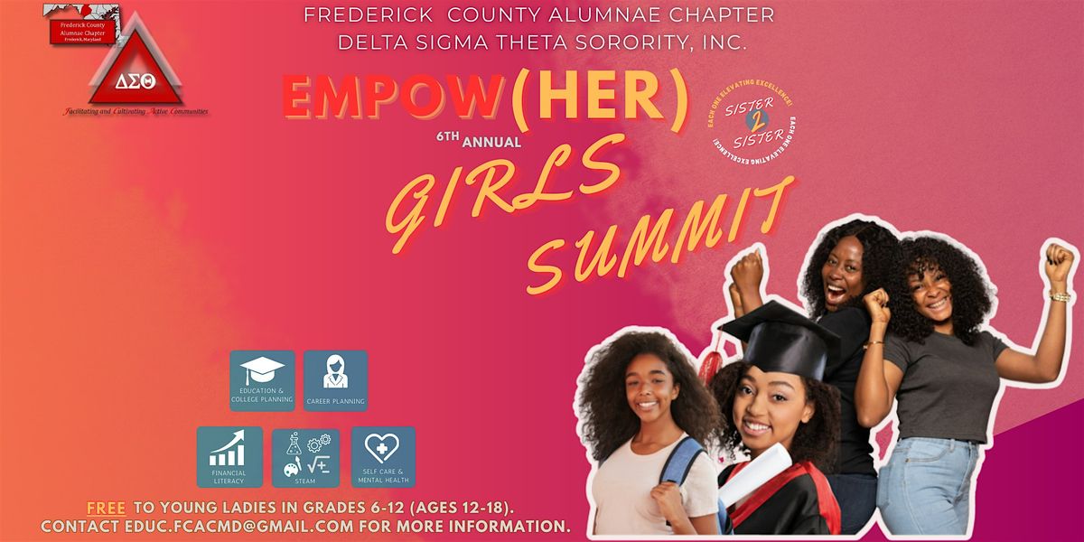 Welcome to the 6th ANNUAL GIRLS EMPOW(HER) SUMMIT! Join us at Frederick Community College, Conference Center E (Room E126AB) on April 18, 2026 at 10:00 AM (Eastern Time) for a day of inspiration, empowerment, and connection. This event is all about celebrating the strength and resilience of girls and women. Get ready for engaging speakers, interactive workshops, and networking opportunities. Let's come together to support and uplift each other. Don't miss out on this incredible experience!