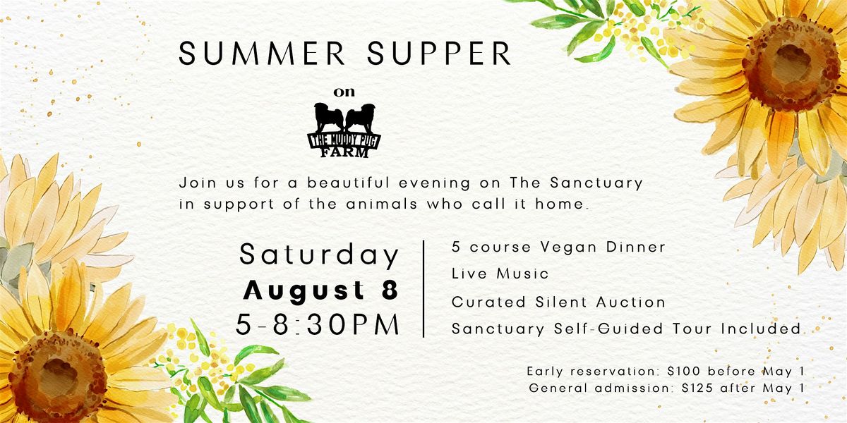 Join us for our 6th Annual Summer Supper at The Muddy Pug Farm & Sanctuary, a golden-hour gathering rooted in community, compassion, and connection.