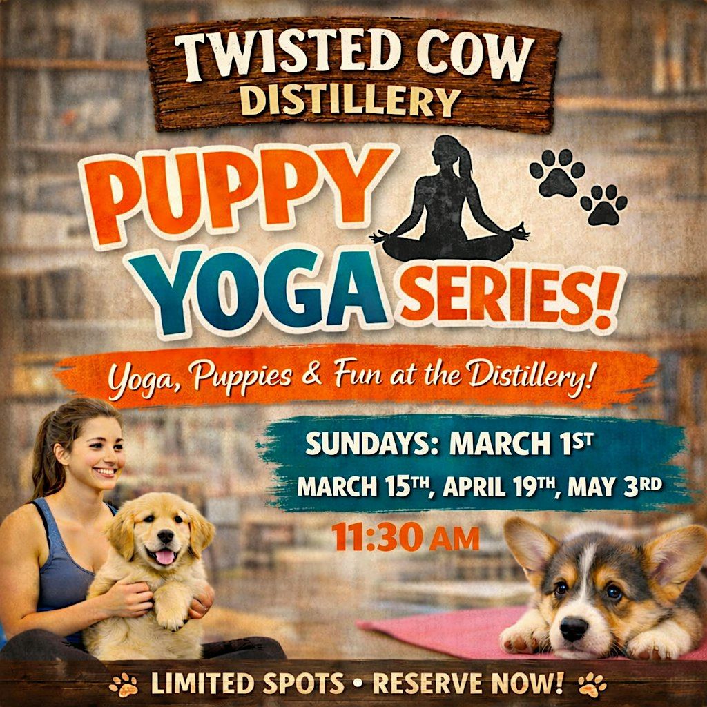 Join us for Puppy Yoga at Twisted Cow Distillery in and Hope for Cleo . Enjoy a fun yoga session while playful puppies from Hope for Cleo Rescue, all available for adoption, join in on the fun! Your ticket includes the yoga class, puppy playtime, and one drink - spiked seltzer, draft beer or spiked tea. Don't miss this chance to relax, connect, and support a great cause! 🐶🍺✨