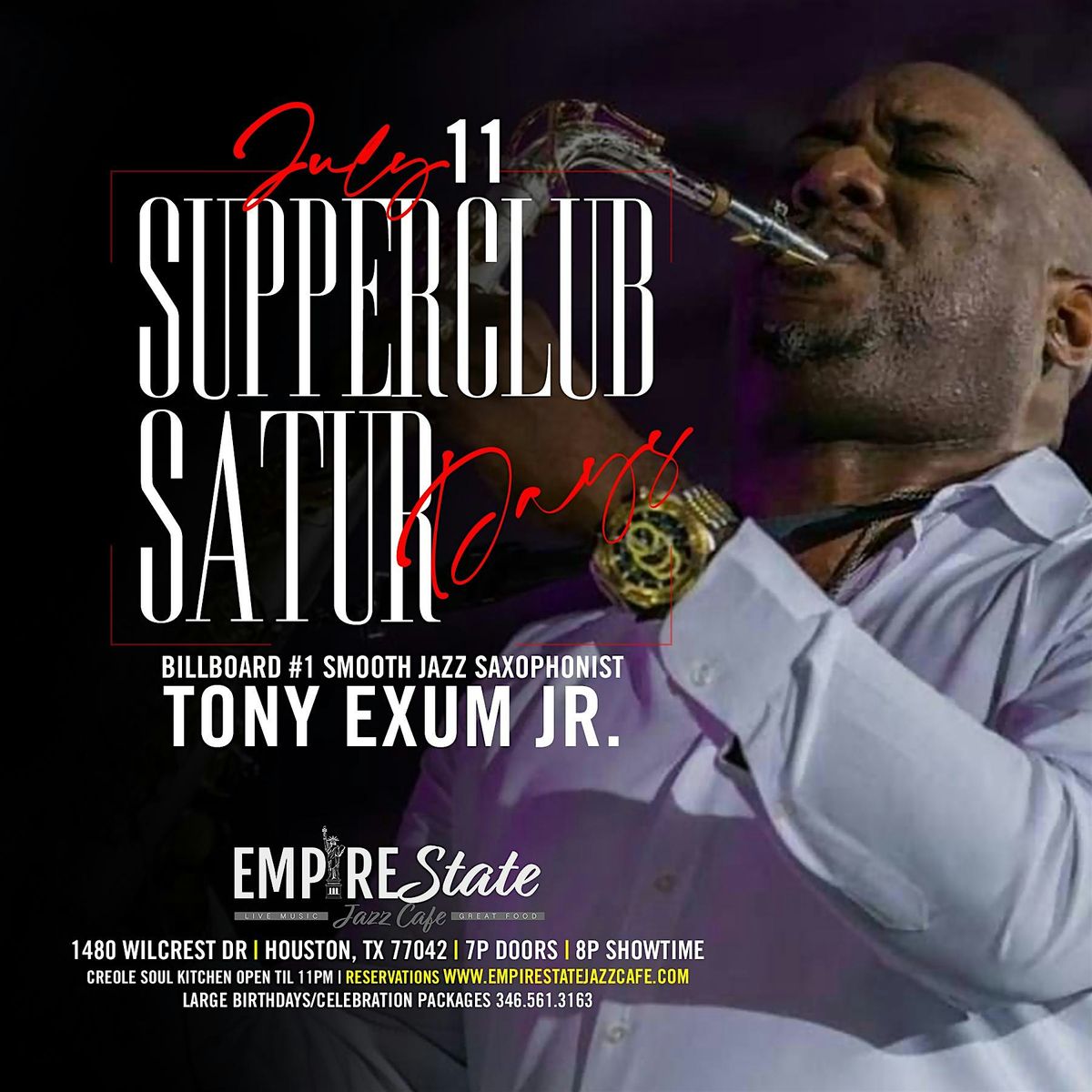 Welcome to the Empire State Jazz Cafe for the 7/11 - Supper Club Saturdays event! Join us on July 11, 2026 at Doors 7:00 PM | Show 8:00 PM for a night filled with amazing music by Tony Exum Jr. Get ready to groove and enjoy a fantastic evening in the heart of the city. Don't miss out on this unforgettable experience!
